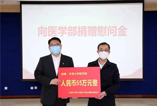 表彰会上,曾获得“支援汶川地震灾区先进个人”的知名企业家、天津大学 62级港口专业校友崔鸿修老先生通过自己在学校建立的大海基金会,向天津大学医学部捐赠55万元慰问金,表达对一线医务人员的敬意与感谢。大海基金会理事长、建工学院副院长高喜峰代表崔老先生致辞并捐赠。