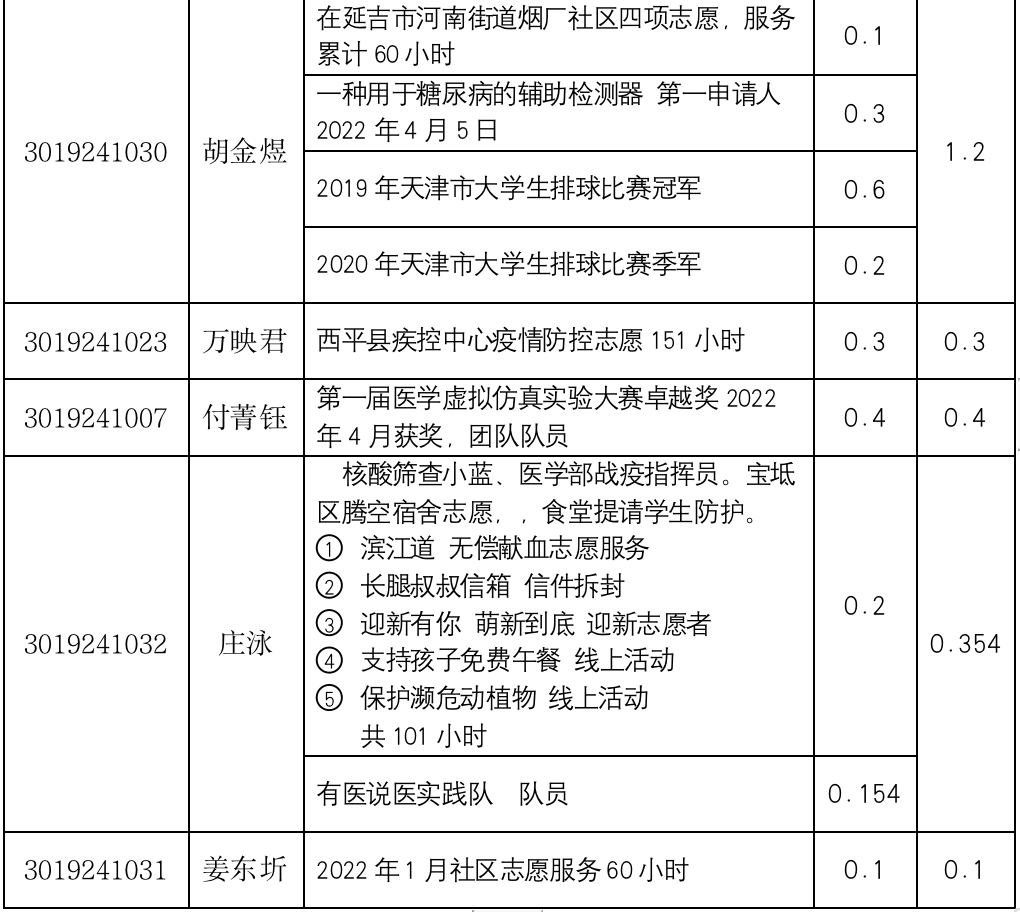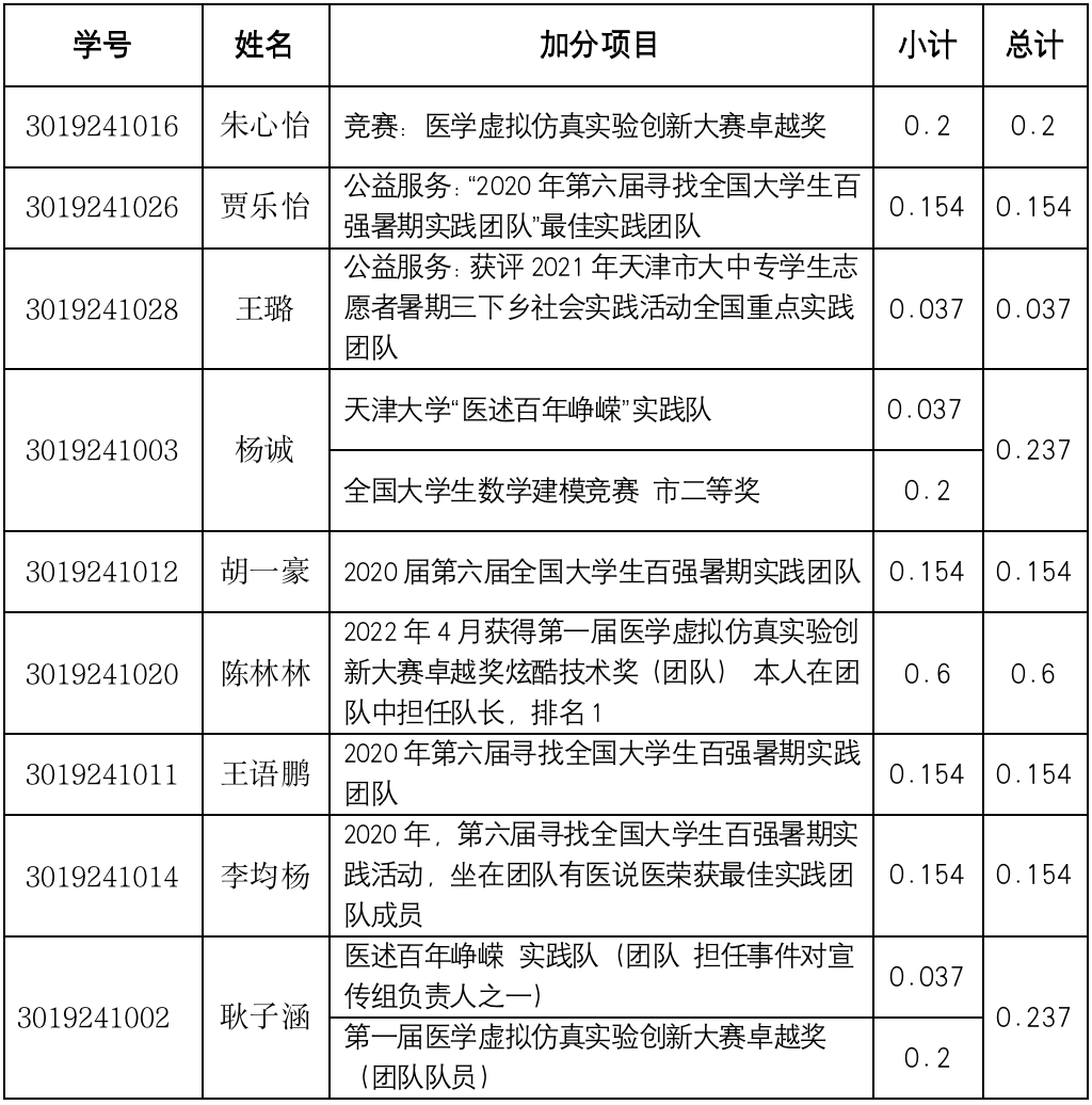 根据《天津大学医学部智能医学工程专业本研贯通计划2023年应届毕业生推荐选拔工作实施细则》,经学部推荐选拔工作小组审核、组织答辩,现将2019级(2023届)天津大学医学部智能医学工程专业本研贯通计划优秀加分结果公示如下: