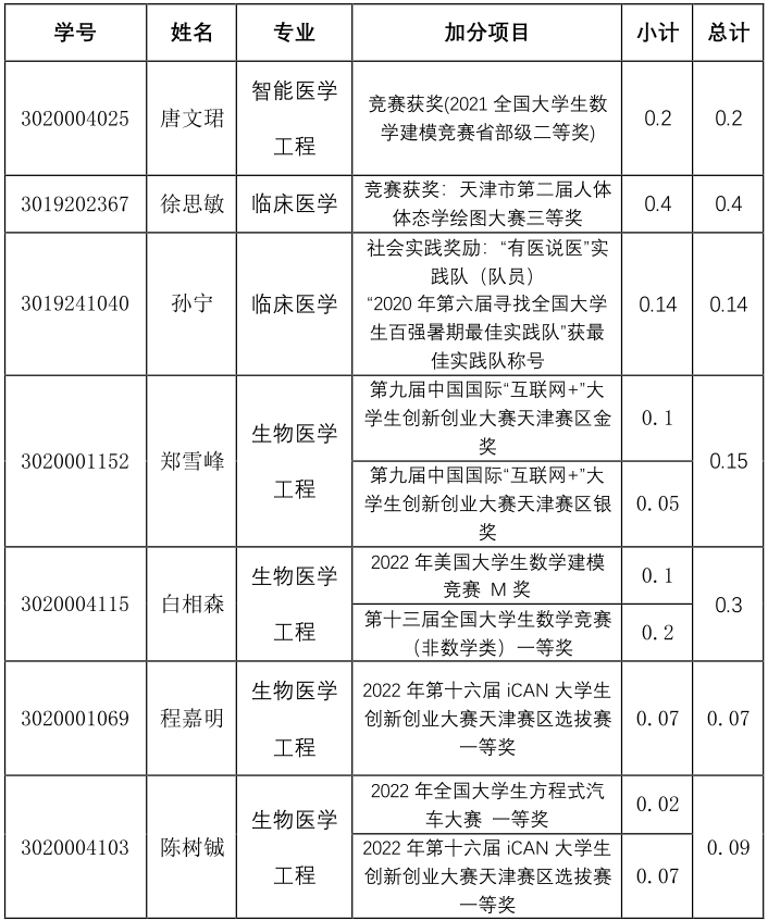 根据《天津大学医学院2024年应届毕业生推免选拔工作实施细则》,经学院推荐选拔工作小组审核、组织答辩,现将医学院2024年应届毕业生推荐免试优秀加分学生加分结果公示如下:
