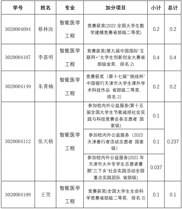 天津大学医学院2024年应届毕业生推荐免试优秀加分学生加分结果公示