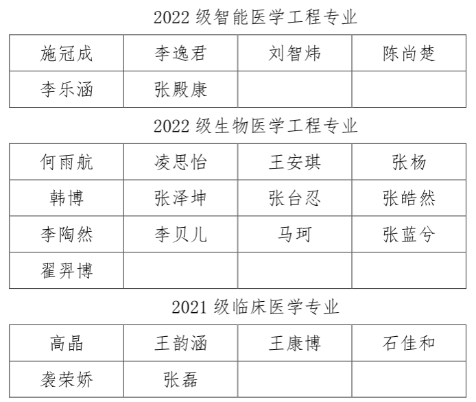 根据天大校教〔2021〕9号(关于修订《天津大学优异生制度实施办法》的通知)及《2024年医学院优异生遴选实施办法》,经学院优异生遴选与考核工作小组选拔,现将2024年医学院优异生计划推荐学生名单公示如下: