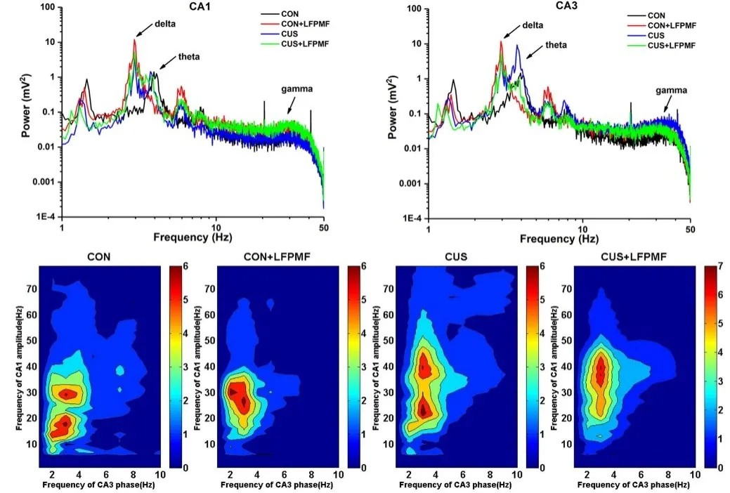 ▲图2:各组大鼠海马脑区LFP功率谱及CA1-CA3脑区间相位幅值耦合分布示意图