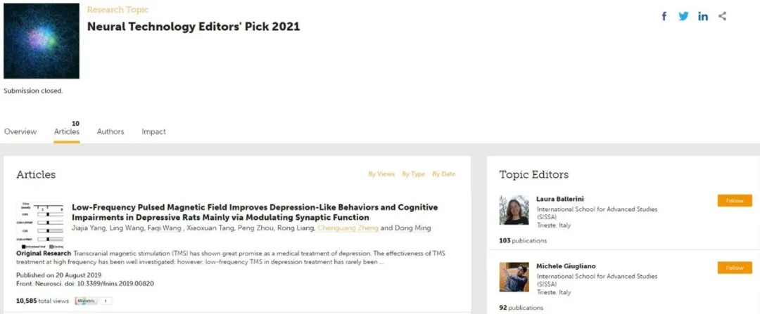 2021年5月,神经科学领域重要期刊《Frontiers in Neuroscience》公布“神经技术2021年度十大精选成果”(Neural Technology Editors'Pick 2021, Top 10),由该期刊主编遴选出10篇近3年发表的最具突破性与影响力的学术论文。天津大学神经工程团队的研究成果“低频脉冲磁场通过调节突触功能改善抑郁大鼠的抑郁样行为和认知损伤”入选其中,该论文浏览量自2019年8月发表以来高达10601人次,在此次公布的十大精选成果中排名前三。该研究首次证实在中轻度抑郁症治疗中,经颅低频弱磁刺激作为非侵入疗法具有良好的临床应用潜力,有望为抑郁者认知损伤的改善开辟新的路径,并提供切实的科学依据。