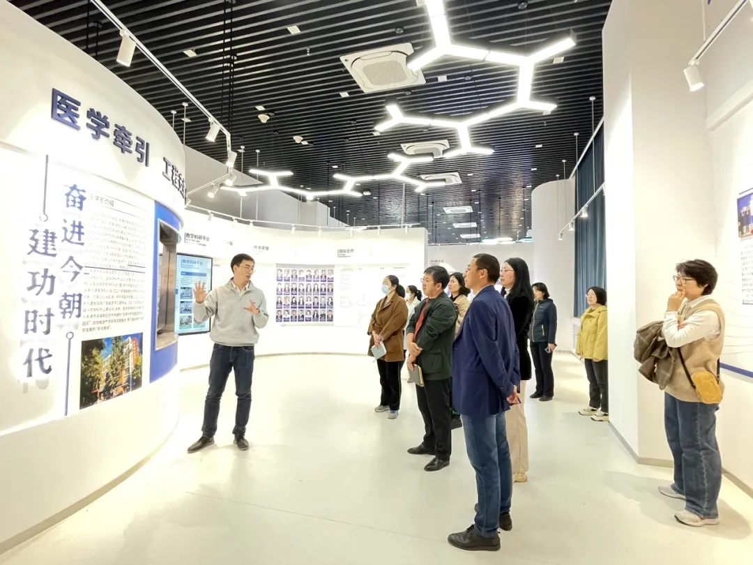 活动中,李振宇和赵晶晶带领图书馆一行参观了天津大学“兴医之路”主题教育馆。展馆系统细致地梳理了天津大学波澜壮阔的兴医之路,共有历史沿革、发展现状、科研布局、科研成果、附属医院及医学中心和医学人文6个版块,溯源巍巍北洋兴医之路,细数天大医科飞速发展成就,展示了脑科学与神经工程、智能医学等领域各项重大科研成果,展现了多姿多彩的医学人文活动带来的魅力,描绘了天大医科发展新版图。